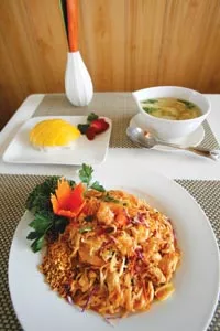 A generous portion of tom yum soup arrived next, steaming and aromatic in an appealing comma-shaped bowl. The plenteous chicken and mushrooms were tender, while the onion was still crunchy, and tomato added bright, fresh flavor to a hot — in both meanings of the word — broth that awakened the senses.