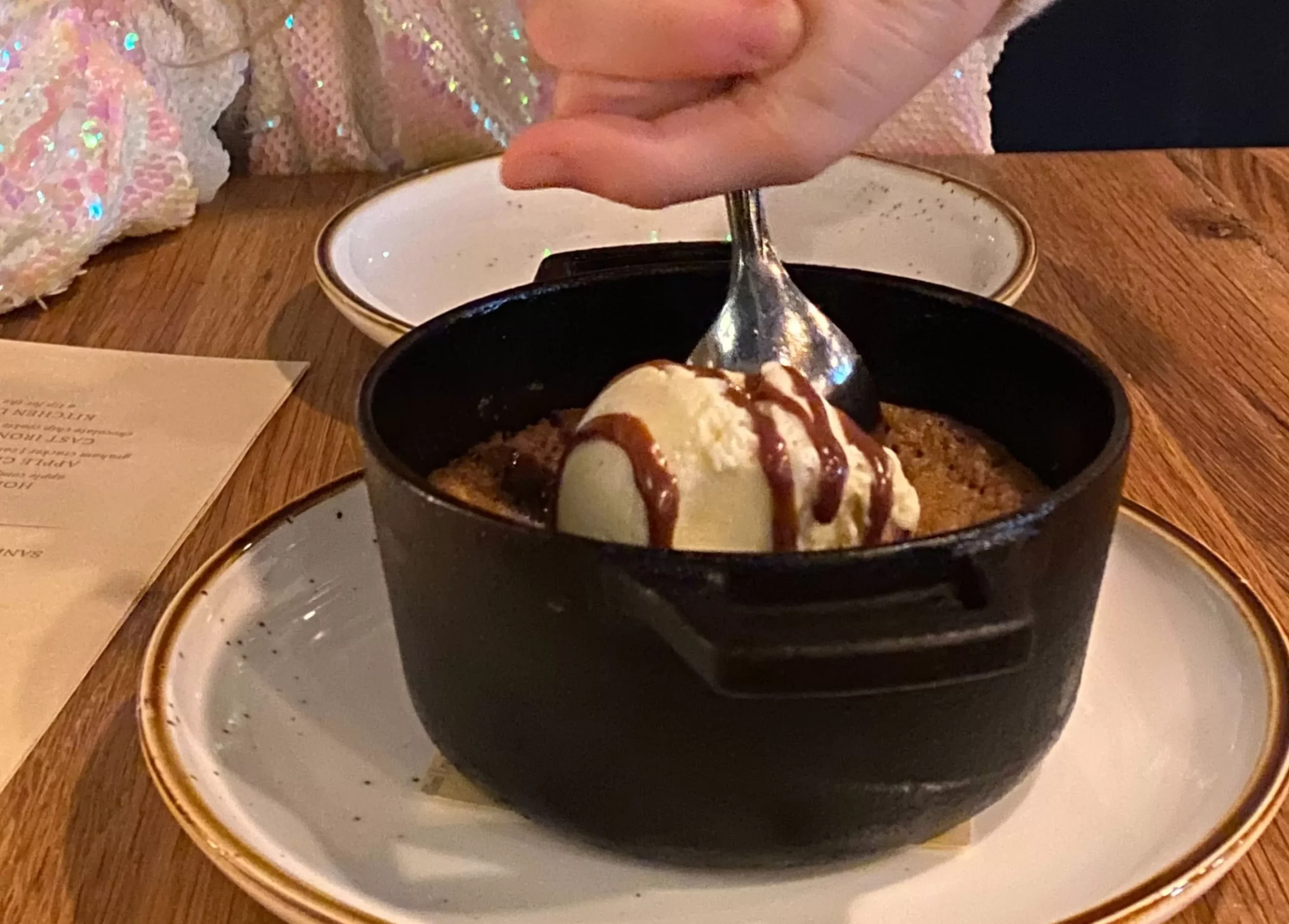 The skillet cookie was a surprise. Our neighbors, a couple from out of town with their grown son, bought us dessert. I will say this was probably the best cast-iron dessert I’ve consumed, mostly due to the texture (yay, crispy!) and the presentation. My daughter loved it because all kids, whether they have adult tastes or not, love cookies and ice cream. These are just facts.