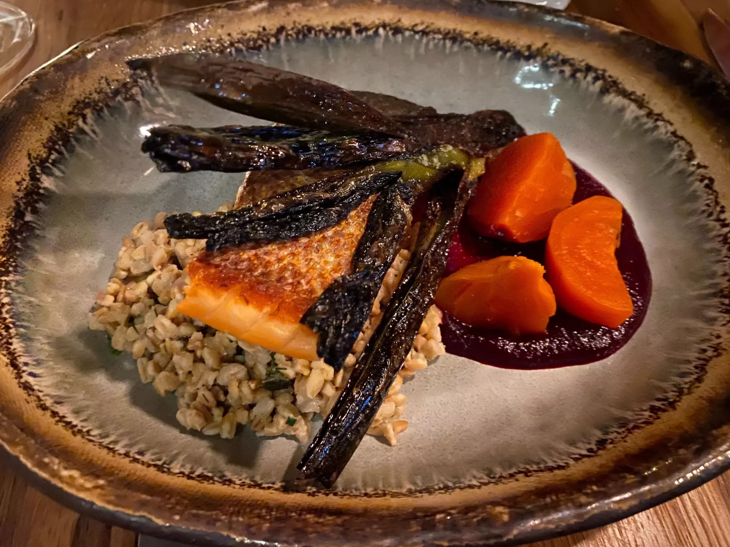 Considering my nine-year-old consumed nearly a whole giant steak after pounding down scallops and toasted baguettes, she couldn’t be bothered with my salmon. However, she did take a couple of quick bites. She said, “Mmm. good. I like the fish with the farro: nice texture! I don’t like beets, but I like these beets. They’re good! Ask the chef how he makes them, and take notes, Mom.” Will do, kiddo.