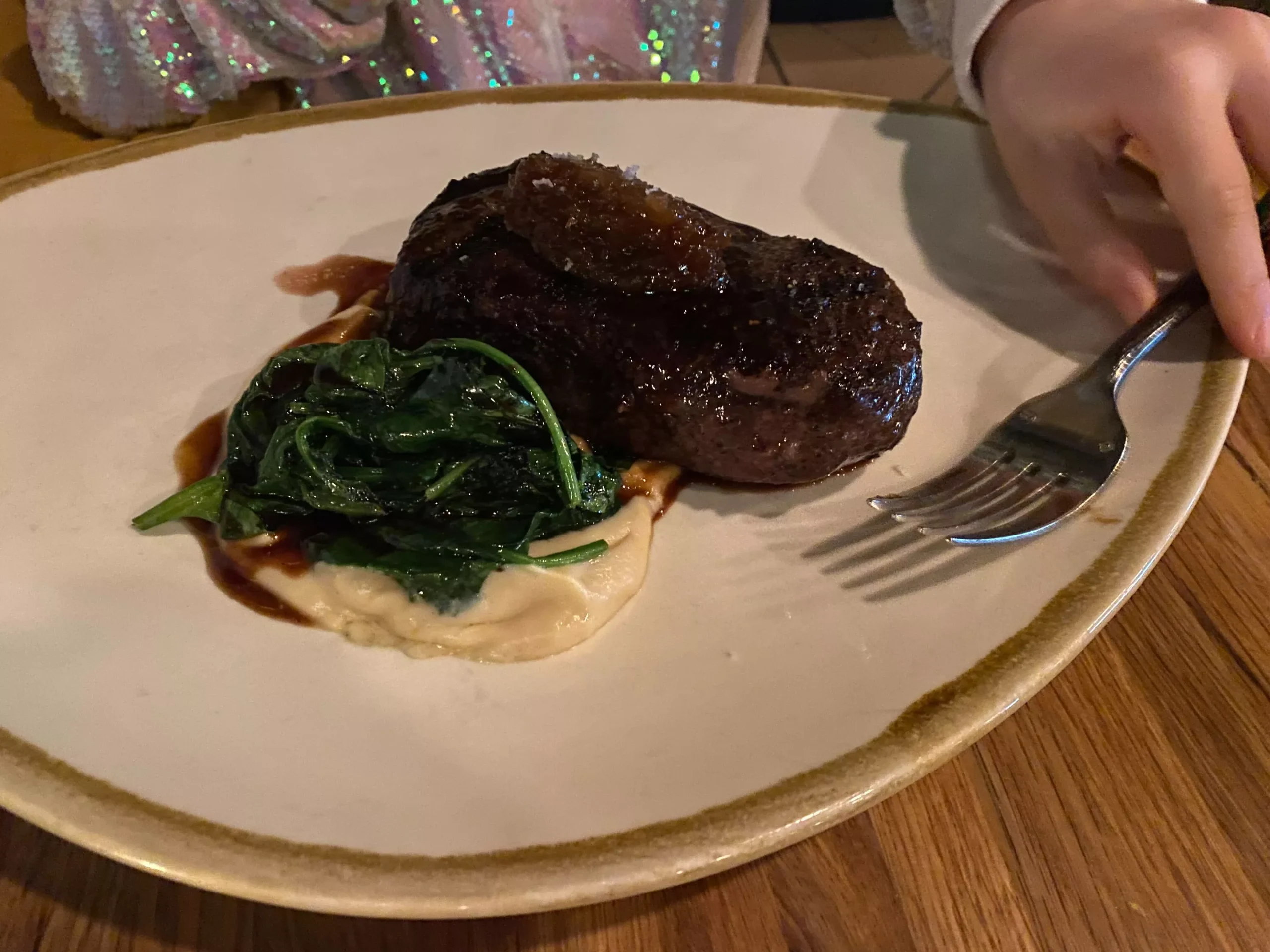 Whose kid likes rare, dripping steak? Mine does. The strip steak was served with wilted spinach, shallot marmalade, a red wine demi, and a magical celery root puree which my daughter suggested we try to recreate at home. There was very little fat, no gristle, and it was perfectly seared. Her only remark was that the sear wasn’t quite as crispy as she likes, but otherwise, she said she loved the whole dish and nearly licked the plate.