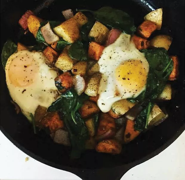 I prefer to use a well-seasoned, 10-inch cast-iron pan for this recipe, but a non-stick oven-safe pan will work as well. Begin by preheating your oven to 400 degrees Fahrenheit. On the stove top, start with a tablespoon of olive oil in the cast-iron pan and turn the heat on high. Raise the temperature of the pan until the oil shimmers, then decrease the heat to medium-high. Place the yellow potatoes into the pan and begin to brown them. Once you start seeing color on the potatoes, add the sweet potatoes. Let the potatoes caramelize and brown on all sides. Turn down the heat just slightly to avoid burning, and add the onions and garlic. Then add the paprika, cumin, chili powder, chili flakes, salt and pepper. (I typically know I have the right amount of seasoning by the look of the potatoes. I like to see even color distribution of the spices, but I also want to see the potato flesh.) Next, add the spinach and let it begin to slightly wilt, adding a bit more salt and pepper. Once the spinach starts to cook, I crack in three to four eggs and place the pan in the oven until the egg whites begin to set around the yolk. Pull out the pan and serve immediately.