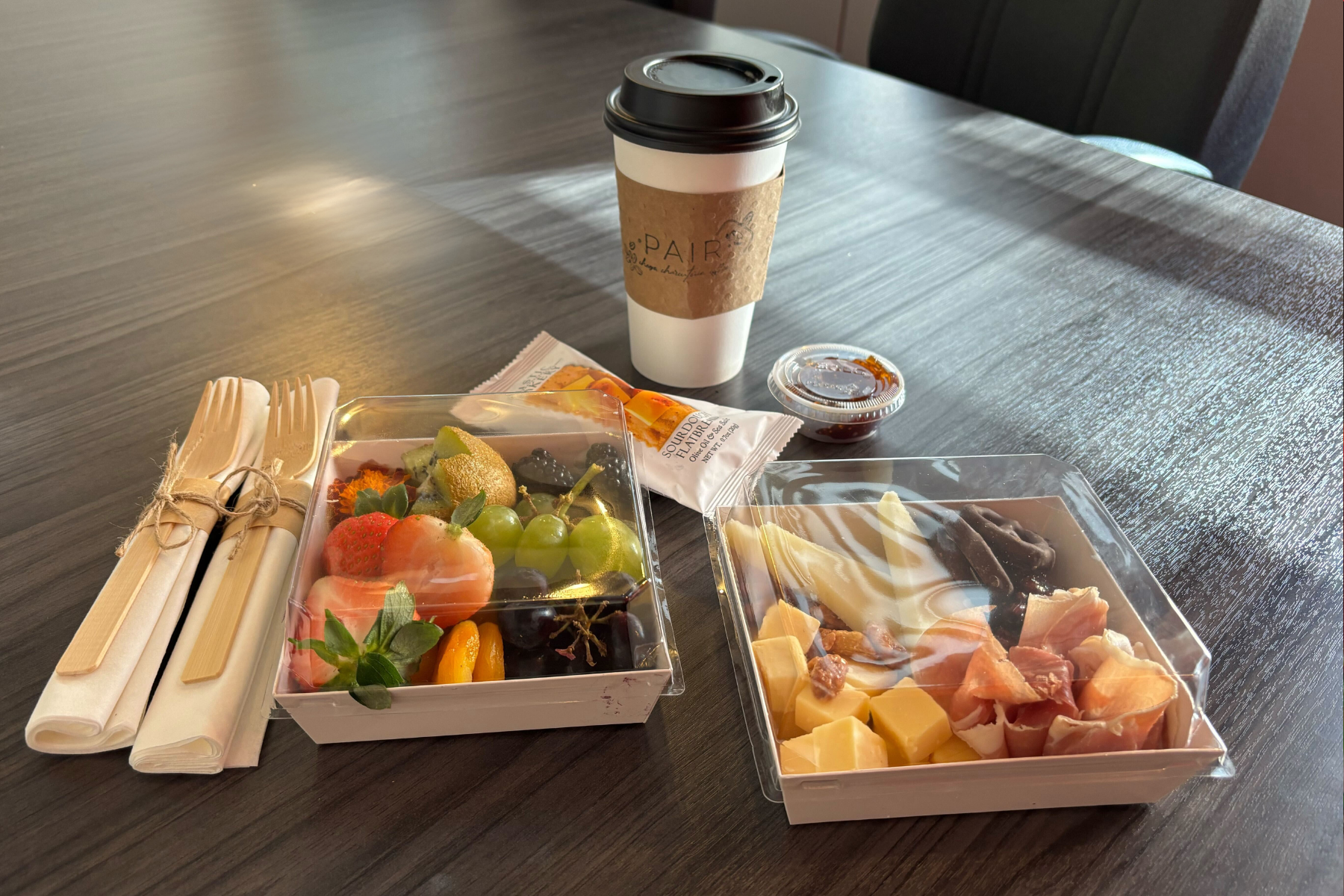 PAIR offers the kind of comfort food I need. As a foodie and a snob for clean eats with great flavor, a cute lunchbox filled with colorful fruit, nuts, chocolates, prosciutto, various cheeses, crackers, and thick jam speaks directly to my soul.