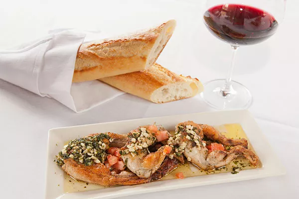 Frog legs were served in a simple olive oil, garlic and parsley pesto in which the plenteous minced garlic had been cooked so gently that there was no fire, only flavor. The meat itself was sweet and succulent, more like tender shellfish than poultry. Also on the plate was a tiny salad, the size of a garnish, but dressed in a light vinaigrette to please the palate without distracting from the main event.
