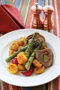 Stuffed calamari consisted of firm tubes of medium-size squid filled with crumbly, mildly spicy pork sausage. The subtle contrast of tastes and textures created a blend of surf and turf more complex and, to our taste buds, more appealing than the traditional beef and lobster.