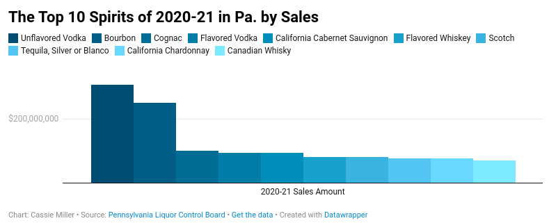 If purchases are any indicator, unflavored vodka and bourbon are far and away Pennsylvania’s top choices for spirits, with the next closest competing beverage more than $150,000 behind in dollar-for-dollar sales.