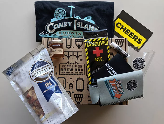 Every month, First Sip features a different brewery. They’ve paired with breweries big and small, from New Belgium to Allegheny City Brewing. The box never contains alcohol (finding loopholes in Pennsylvania liquor distribution laws to ship beer would have required Dennis and Sam to buy an actual restaurant). Instead, it’s filled with “beer gear.”