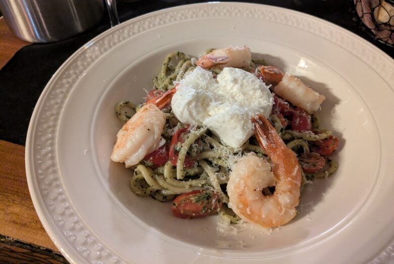 The Basil Pesto noodles delivered bite and were dense without being claggy, their thickness providing plenty of real estate for the lovely green sauce to cling. The milky cheese and other ingredients folded in nicely, with the tomatoes supplying a bright sweetness usually unheard of for late-season produce. Though unnecessary, the optional addition of shrimp (other proteins are also listed) further elevated the dish, pushing it into “too much” territory without actually crossing the line.