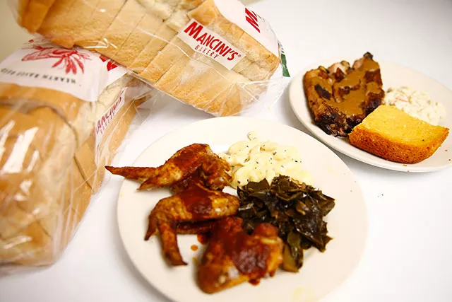 At Ribs N Bread, Thompson features three sauces: mustard, red, and house (a blend of the two). Diners have a choice of which sauce goes where, though most customers stick to the same outline — mustard sauce on the chicken and red on the ribs.