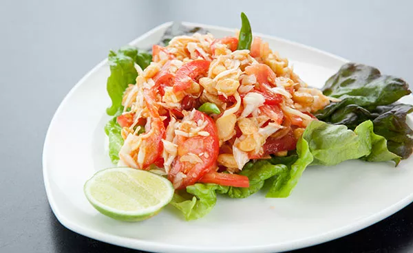 Except that would have kept us from pickled tea-leaf salad, a combination unlike anything we’ve ever tasted. Marinated tea leaf, finely shredded cabbage and tomato were tossed with peanuts, broad beans, yellow peas, sesame seeds and dried-shrimp powder for a nutty, crunchy salad with a range of subtle yet distinctive flavors. Despite the pickling, the flavor wasn’t pungent, but rather an addictive mingling of earthy, astringent, briny and mildly bitter notes, unified by a fresh lime dressing.