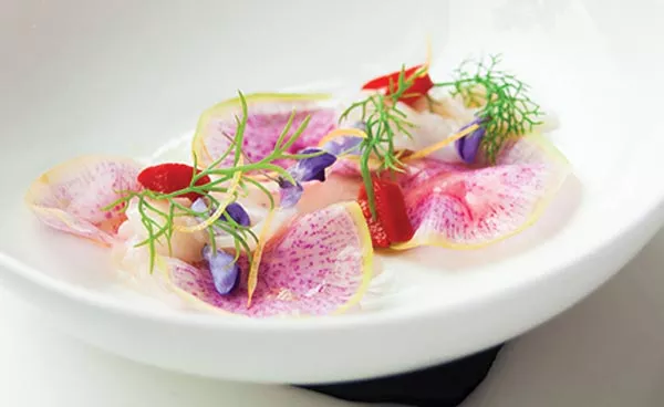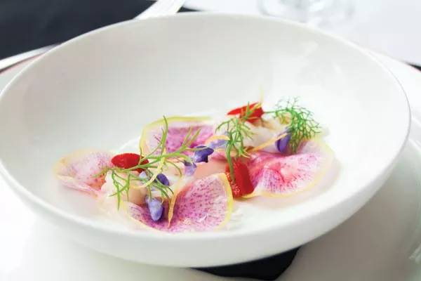 Some of Senti’s polish derives from its location in a new apartment building at Doughboy Square. Its storefront spans quite a bit of sidewalk glass, extending into a recessed courtyard. Senti eschews the current trend for rustic neutrals in favor of a crisp color scheme that contrasts stark white with plush purple, accented by bold, abstract paintings on the walls. A long booth — more like a couch — upholstered in white leather breaks up one of the dining rooms, and the corners make for cozy, if not private, dining.