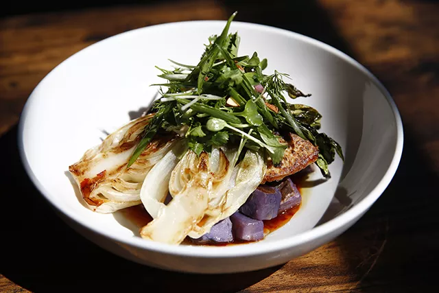 Fairlane is stylish but not overly hip. Every part of the restaurant is tastefully designed, down to the paper towel dispenser in the bathroom. Parts of the building’s past are revealed through garage doors that line the front and industrial, metal pipes that snake around the ceiling. Fairlane is poised for mechanics to roll out and lift a car, which is fitting since its namesake is a vintage Ford.