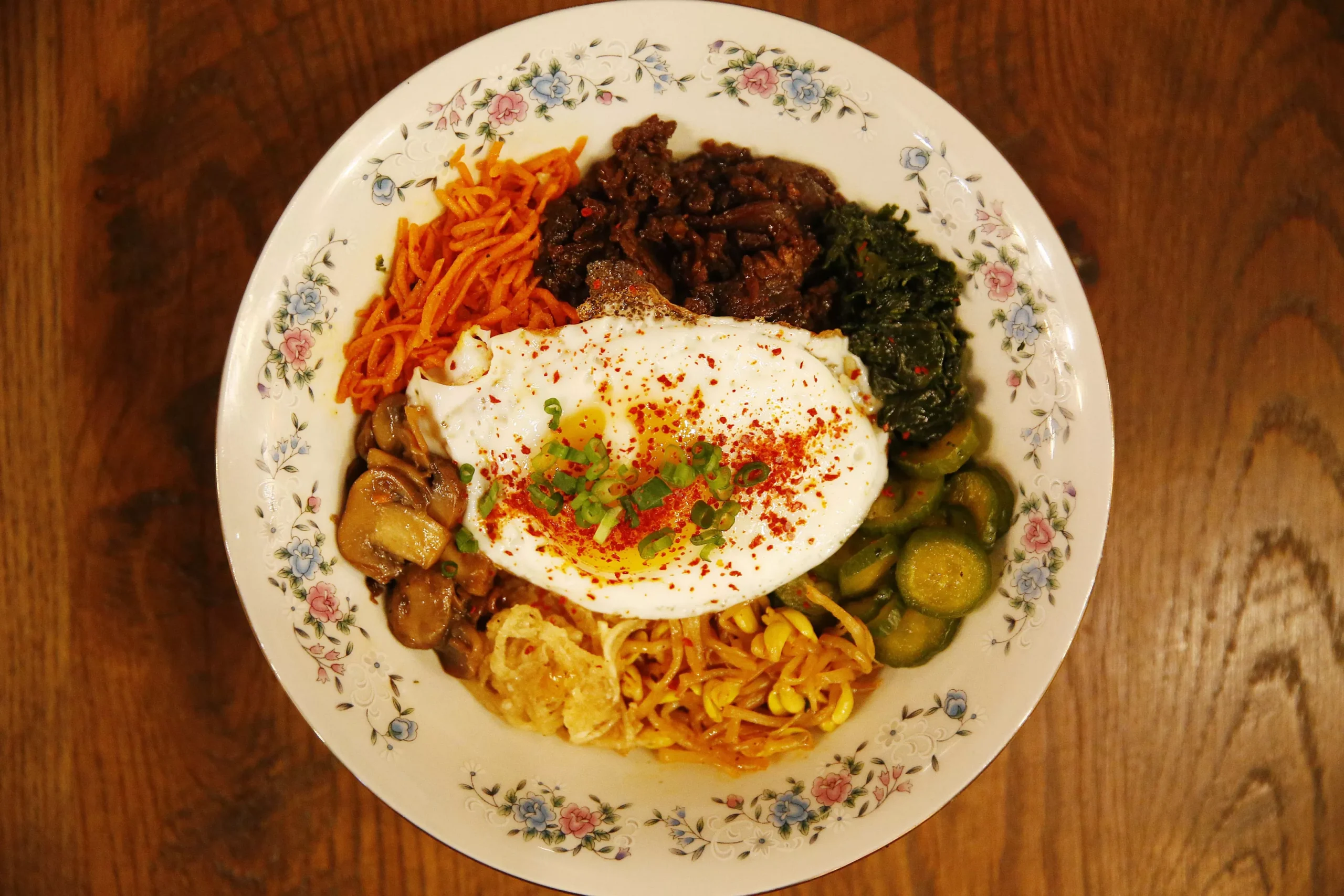 I managed to narrow my order down to a few items, starting with gimbap (bibimbap rolled into sushi). Chough described the dish as “all the food groups in one bite,” with a satisfying taste-texture combination. Mondu, Korean dumplings, were another delightful starter, the small pockets packed with pork and pan-fried in triangles.