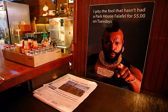 A sign of Mr. T that reads, “I pity the fool that hasn’t had a Park House Falafel for $5.00 on Tuesdays,” hanging inside the Park House Credit: CP Photo: Jared Wickerham