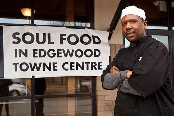 The restaurant’s new digs, in Edgewood Towne Centre, are its most spacious and gracious to date, standing out from other local soul-food places that all too often tend toward barebones interiors. Oak flooring, wainscoting, tables and booths give warmth to the surprisingly large dining room, while flowers and lamps on the unused bar add a homey touch. On Sundays, the after-church crowd fills every table, but on a wintry Thursday night, we almost had the place to ourselves, while take-out customers came and went.