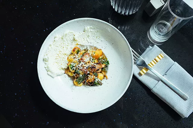 The socca arrived first, served with three sauces covering sweet, acidic, and savory. Then came the pork rillette, a pâté-like version of chilled, shredded pork paired with pickled vegetables, and the twice-baked ricotta, a fluffy, house-made cheese dripping with honey and lemon. Finally, our table was graced with the potato and apple cake (like a latke), dressed with a mash of salted cod and a sweet apricot and butternut squash jam-like spread.