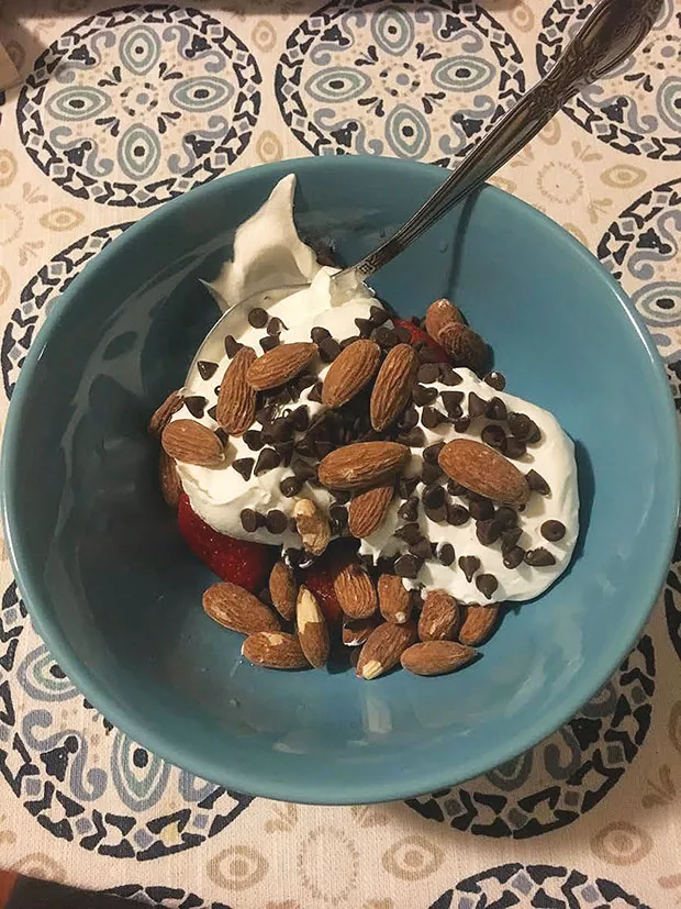 Remember as a kid when your grandma used to top a bowl of cherry Jell-O with Cool Whip and it was considered a treat? These days, I use the trademarked, artificial whipped topping in dishes that once held underrated vanilla ice cream. I’m working on self-acceptance, using the mantra “My body doesn’t determine my self-worth,” and trying to convince myself that self-love is possible as a plus-sized lady, yadda yadda. But I also realize I can’t eat whatever shitty food I want, not exercise and expect to recognize myself in literally any photo taken of me in the last year or so. So while there is a growing number of commercials, social-media hashtags, and conversations that throw around the term “beach body,” for someone who is overweight, can’t swim and is as pale as a pile of snow, the beach has never been my scene. Nor do I intend to spend my days worrying about whether my body is the appropriate size to stuff into a two-piece, high-waisted bathing suit. I’ll let my thighs jiggle while walking in the hot sand whenever I feel like it. All of this to say, go to the beach if you like being wet for longer than 10 minutes, or the average showering time, if that’s your thing. Also, try this simple snack whenever you’ve really got a sweet-tooth craving and are trying to cut back on desserts, but just aren’t there yet.