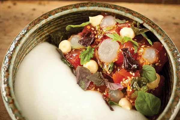 Poke was dominated by the clear, meaty flavor of fresh tuna enhanced by seaweed and a little white onion; and the ultra-light, black-sesame-studded rice crisps served with it were marvelous. We could have done without the dessert-like froth of “lime foam” that was supposed to counterbalance a spiciness we couldn’t detect.