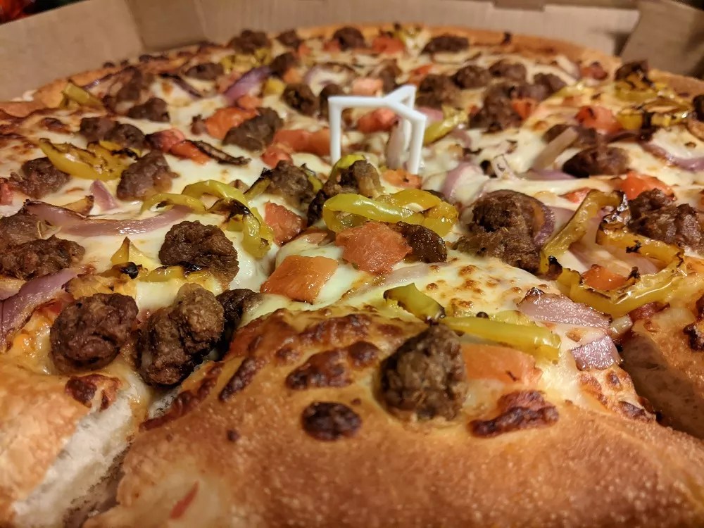I ordered the Great Beyond Pizza, a “specialty pizza crafted with fresh veggie toppings that include tomatoes, sliced red onions and tangy banana peppers, served up on Pizza Hut’s classic Original Pan crust paired perfectly alongside the savory Beyond Italian Sausage.”