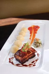 In the grilled romaine salad, a quartered heart of romaine was cleverly charred over high heat in order to introduce a bit of caramelizing and barely wilt the leaves. Bacon-crisp strips of prosciutto and shaved Asiago cheese added texture and salty savor to the salad. In the lemongrass spring roll, an herbal, almost sweet interior met its match in a fiery pairing of sambal and jalapeño salsa. Chipotle tuna tartare combined three of Angelique’s favorites and then topped them with a rich cap of avocado crème and wasabi tobiko. Most interestingly, the fish was pureed, not merely minced, resulting in a dense, custard-like texture that was intensely flavorful.