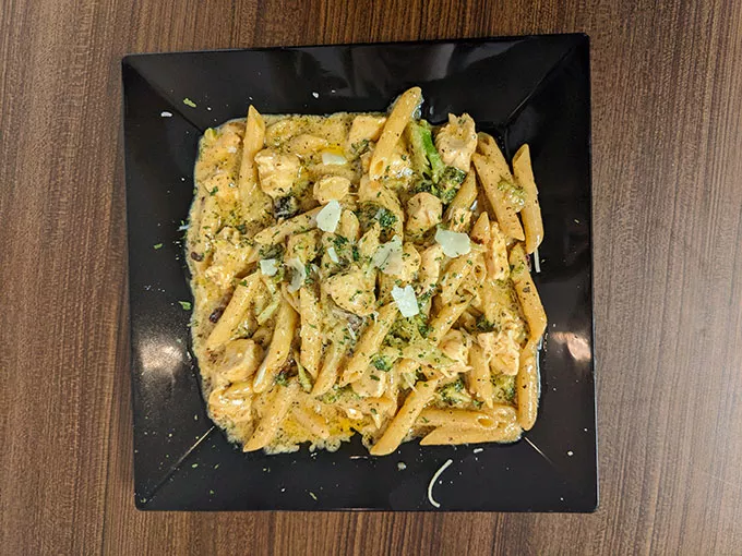 The entree-sized pasta list includes The Don (lobster, shrimp, and broccoli) and The Timmy (chicken, broccoli, and bacon). Though both are listed as alfredo pastas, Houser’s alfredo doesn’t resemble the heavy, pasty versions we’re used to. It’s full of flavor, but not so heavy on the cream to sit heavy in your stomach.