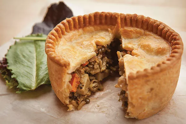 And while you’re there, don’t miss the pies and pasties (rhymes with dynasties), which feature a hearty, savory crust that is flaky yet bakes up tender, not crunchy, thanks to its traditional ingredient: lard. (A vegan version is also available.) It was good enough that we didn’t mind the occasional bite with too little filling. Not to malign the fillings: In addition to the aforementioned curries and traditional Scotch (lamb), Cornish (steak, with hearty morsels of root vegetables that retained their individual flavors) and English (pork topped with a layer of tangy Stilton), you can try steak and oyster (alas, out the night we visited), salmon au gratin and, inevitably, pierogie.