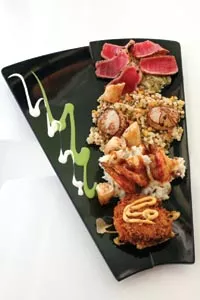 We also ordered an entrée, Three Rivers Tapas, as a starter. A large platter beautifully arrayed with four types of seafood made a favorable impression, one that was mostly borne out by the food itself. Angelique liked the crab cake’s extra-crispy breading exterior, but Jason duly noted the too-bready interior. Seared tuna on Asian slaw was an excellent version of a modern classic, with almost-sweet ruby-red fish and pungent wasabi. A pair of fat scallops could have used a bit more sear, but were nonetheless well-cooked, and matched well with the aforementioned grains, a pleasant range of large and small, tender and firm. The only real letdown were three shrimp in barbecue sauce: The flesh was too soft and the sauce too mild — not quite sweet or hot — to really succeed.