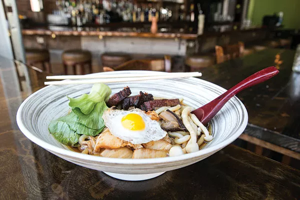 Ramen with pork belly, kimchi, bok choy, quail egg and shiitake broth Credit: Photo by John Colombo