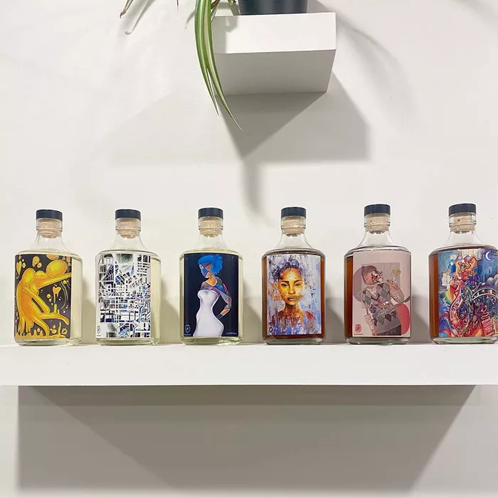 Kelsie Sinagra of Bar Botanico says they wanted the consumer’s choice to be between artwork, not cocktails; any of the seven artist labels can be paired with either cocktail. Artists, who receive a portion of the sales from their label, include Phil Seth, Rachna Radar, John Muldoon, Morgan Overton, Darrin Milliner, and Juliandra Jones and Dejouir Brown.