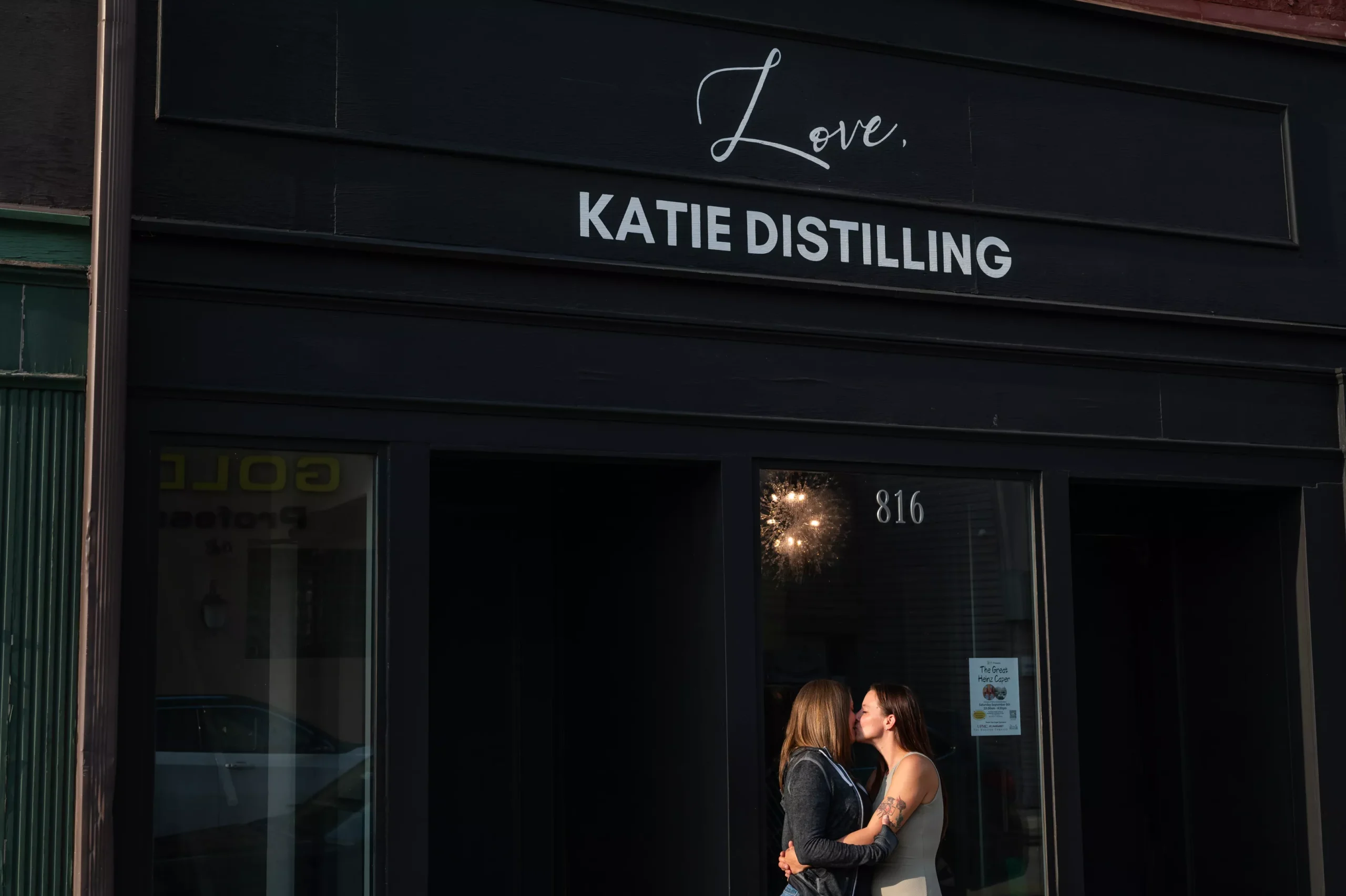 Katie Sirianni and Jen Procacina kiss in front of Love, Katie Distilling in Sharpsburg. Credit: CP Photo: Mars Johnson