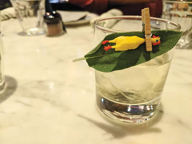 The washed rye is mixed with apple brandy, apple cider, maple syrup, and lemon. Every sip of the Turducken is bright, warm, and refreshing. It’s a fall cocktail that won’t add to holiday weight gain. The drink is finished with a playful touch: a rubber chicken is clothespinned to the glass.