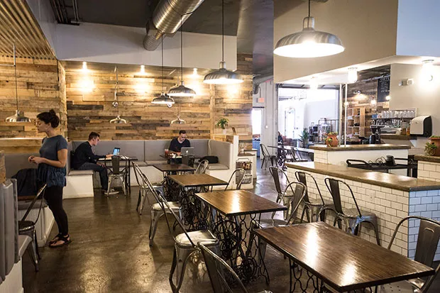 “Café” is fair, but one could bump it up to “lounge.” How else to categorize a spot with such an inviting assortment of seating and congregating areas? There are nooks with armchairs; a tiled bar with high stools; booths; small tables for two (these are actually beautifully restored old Singer sewing-machine stands); a home-like coffee-table-and chairs space, near a shelf of board games; a free library; a kids’ play area; and, weather permitting, outside seating near a raised herb garden. There’s even that East End rarity — off-street parking.