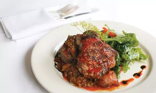 We scored what must be the best seat in the house in winter, the table next to the red-tiled fireplace. Outside, where pretty plantings along a stone retaining wall soften the roadside setting, there’s a small, sheltered garden seating area with a chiminea. Here we noticed a hanging basket of grape tomatoes; sure enough, they showed up throughout our meal, fresh in salads and seared on the side.