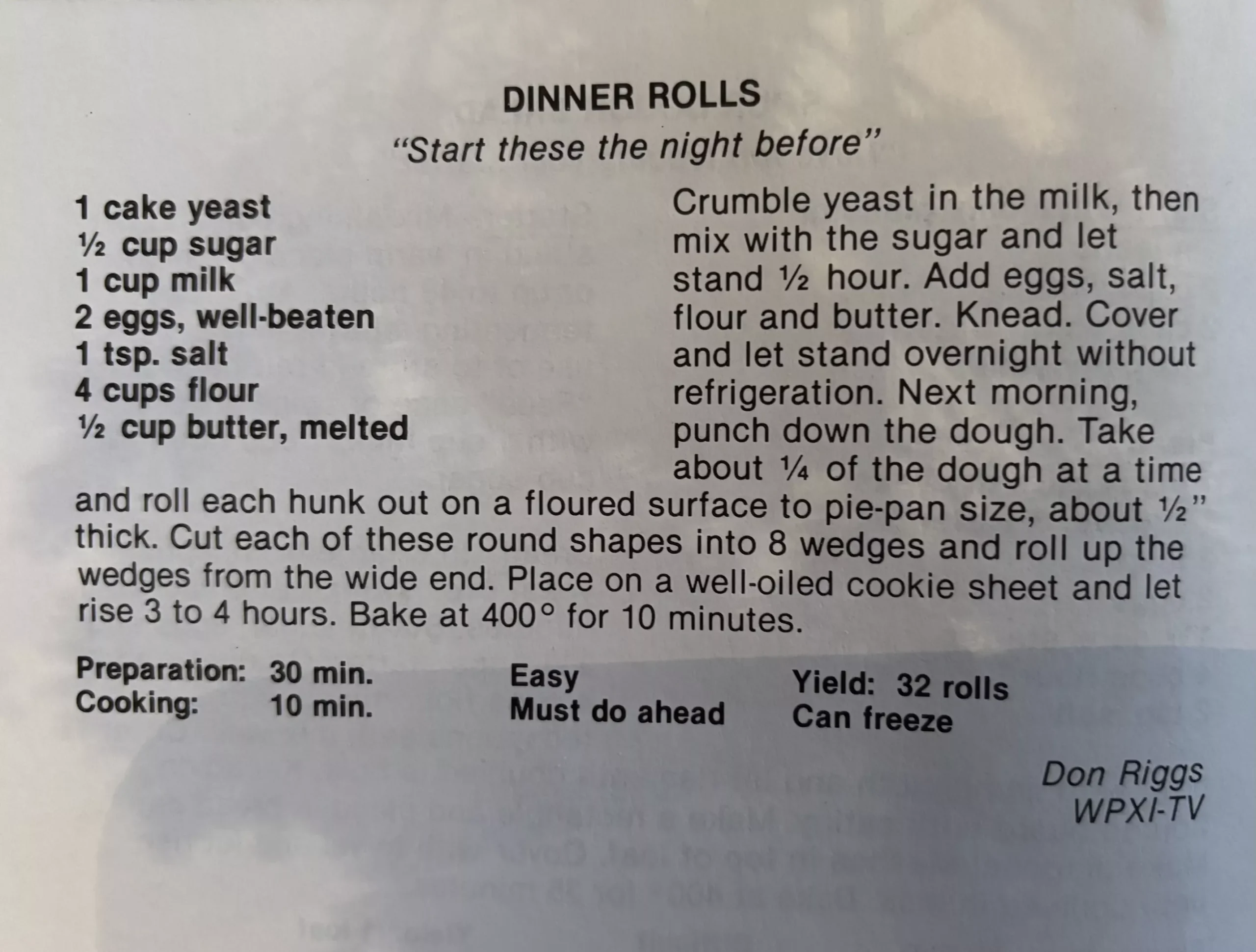 But on the home front, Don Riggs and his wife, Joan, raised four children: two sons and two daughters. The couple also cherished their four grandchildren. No wonder this recipe produces so many rolls. I can only imagine the dinners at Don’s house, especially when his four kids were all teenagers!