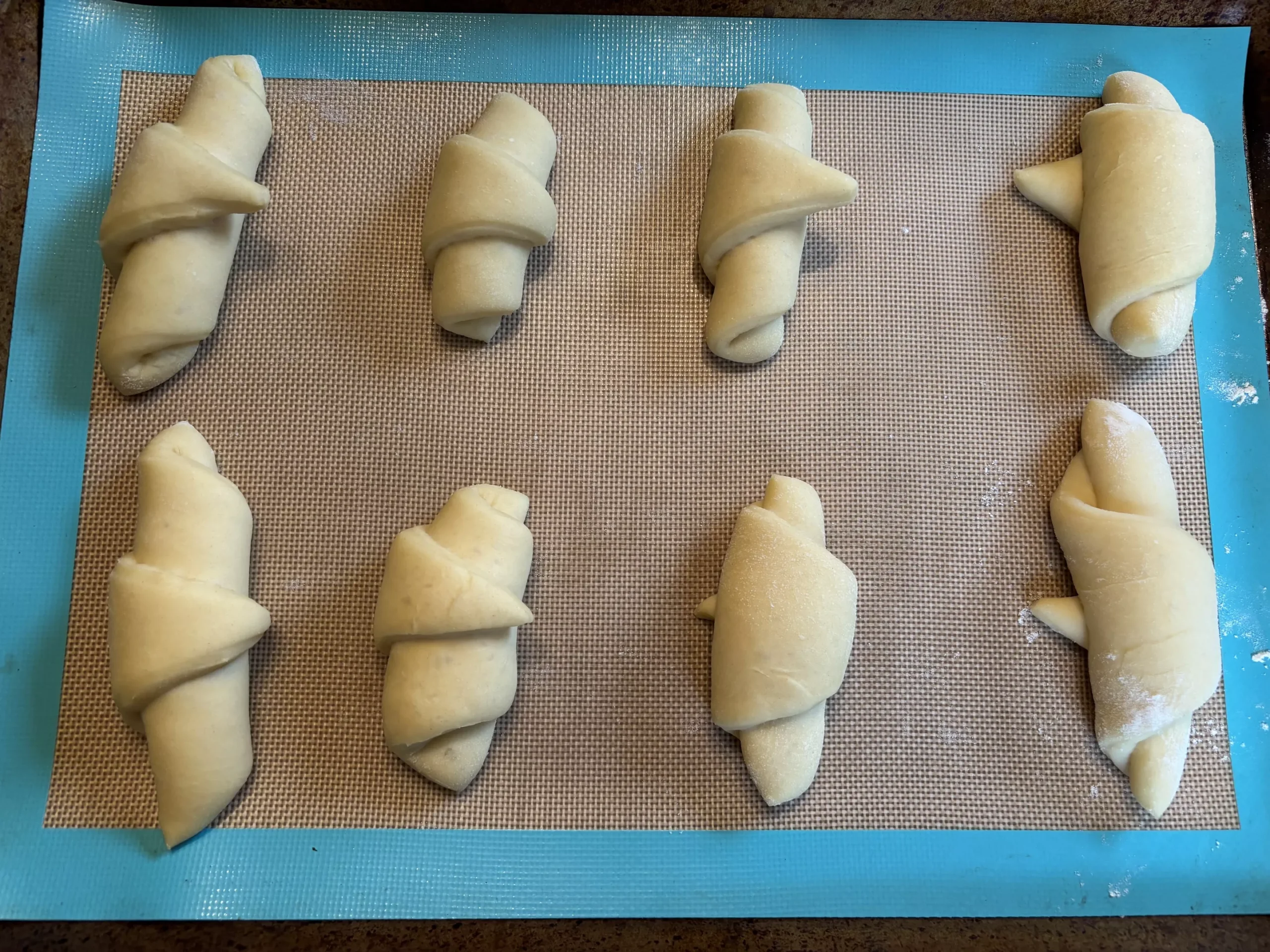 Then came the fun part: making the little rolls! Yes, these look just like Pillsbury Crescent Rolls, but they are denser, breadier, and have less butter flavor. I rolled these up and let them sit for about 3 hours before baking them in the oven on a cooking sheet with a silicone cover (instead of grease). Ovens vary, but 11 minutes was the magic number for me. I slathered these babies in melted butter after they came out of the oven.