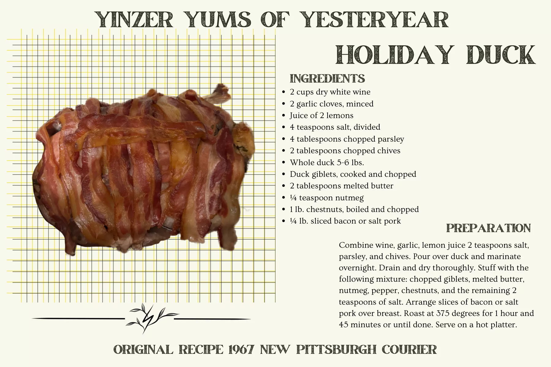 Since turkey and ham are out, I’ve decided to roast a holiday duck. While perusing old Pittsburgh newspapers for recipes, I came across this article called “Brazilian Feast for Christmas” in the Dec. 16, 1967 edition of the New Pittsburgh Courier.