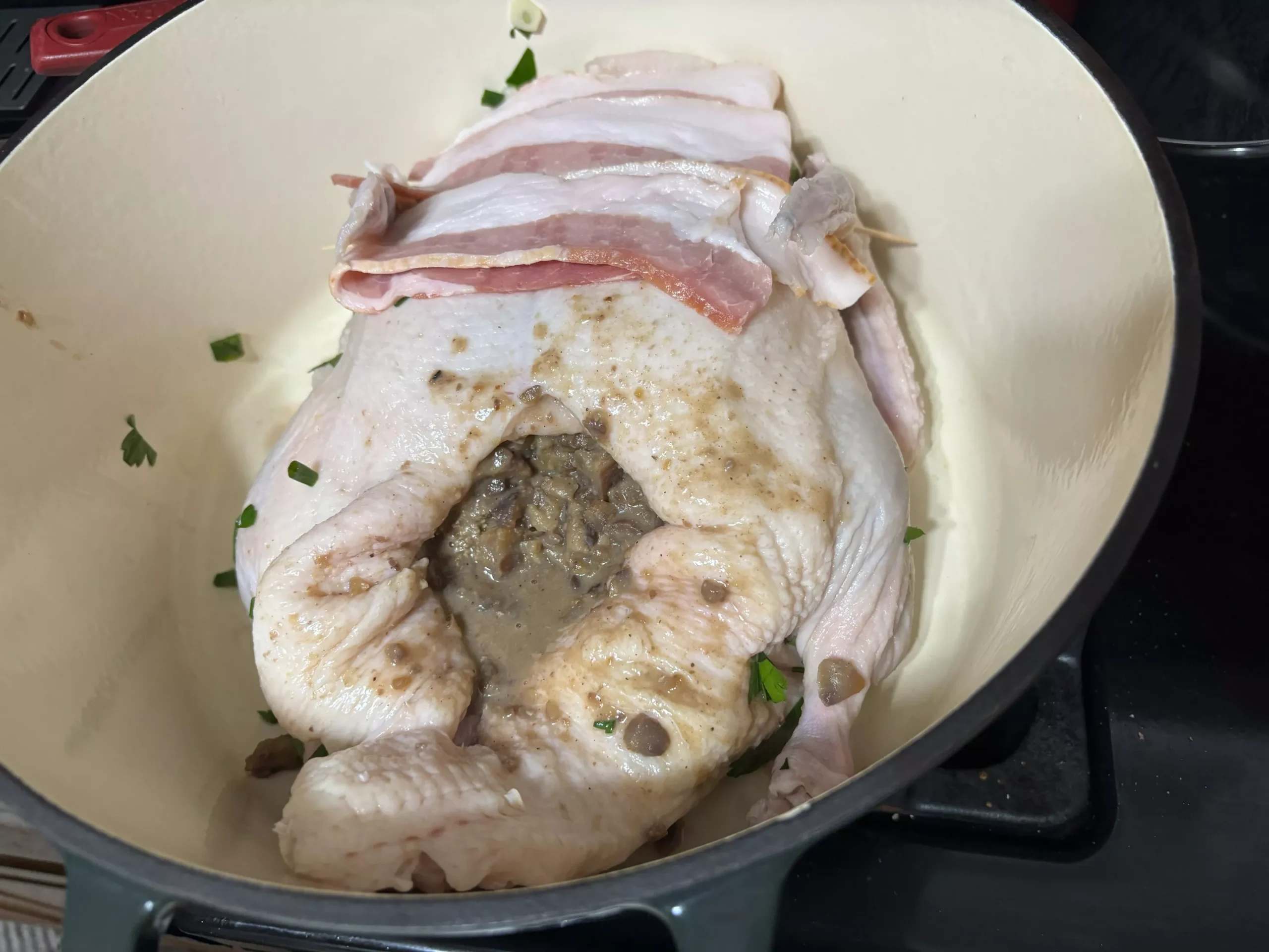 Also, instead of using a measly ¼ lb. of bacon to cover my duck, I used the entire package. My partner agreed that more bacon is always the right answer. And I did not serve the duck on a hot platter because I don’t love when my children get 3rd degree burns.