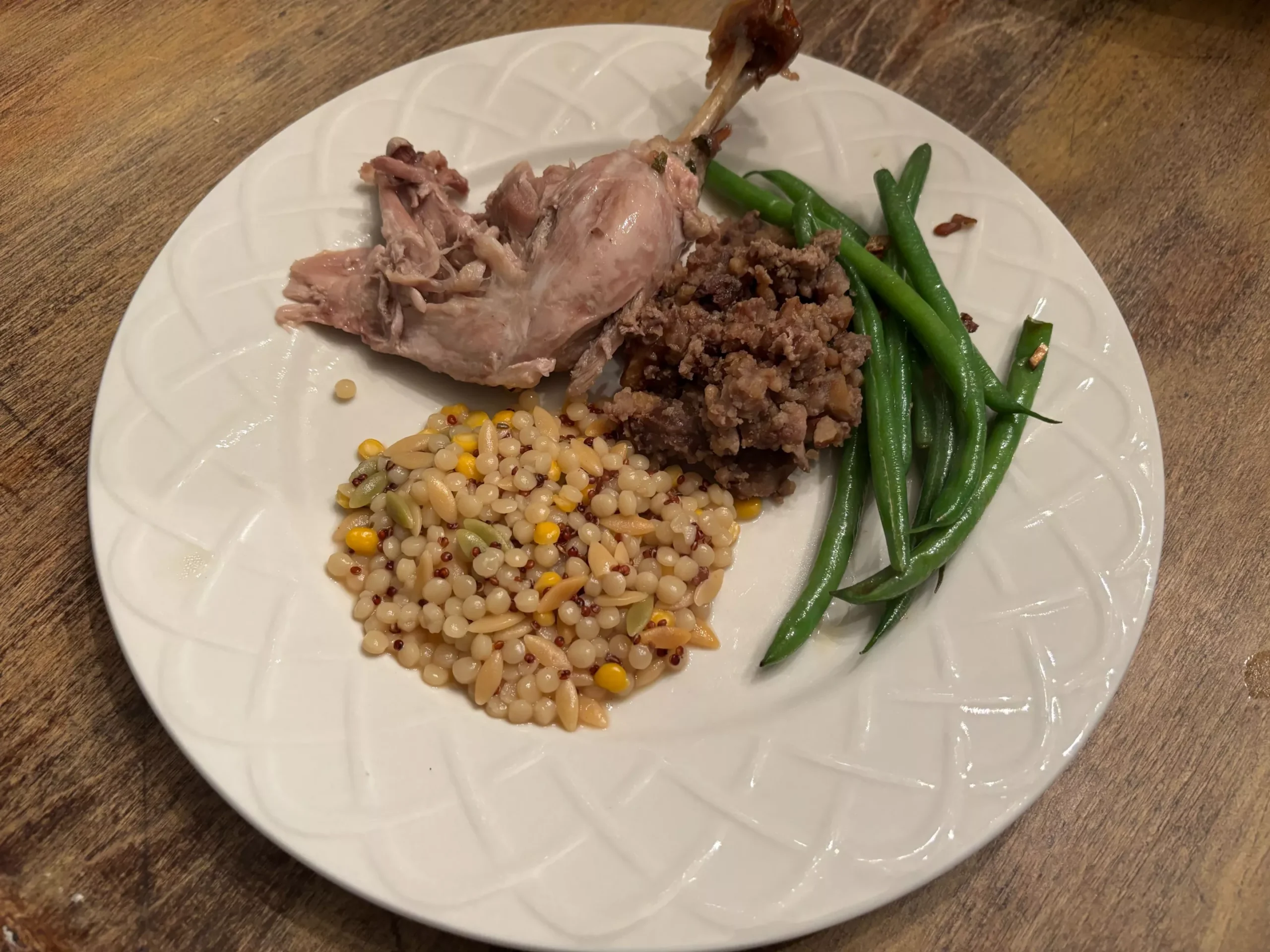 This recipe is entirely gluten-free as-is. I served it with green beans and a 5-grain medley (not gluten-free). Both my kids and my partner gobbled up this lovely bacon-covered duck. We saved the leftover duck fat to make rillettes for my holiday charcuterie board.
