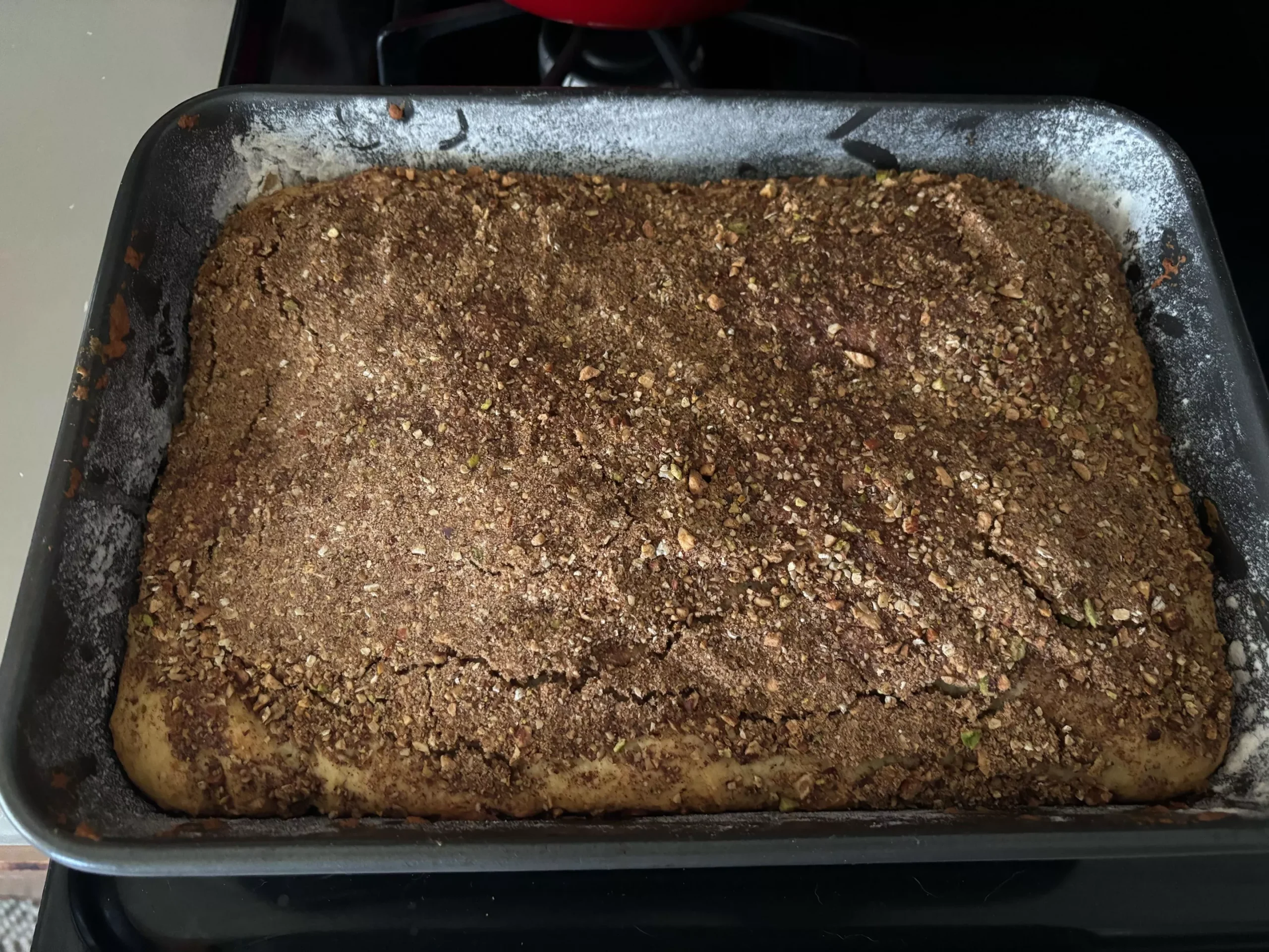 As for the topping, I used a mixture of almonds and pistachios for my chopped nuts, omitted the wheat germ (since I couldn’t find any to save my life), and substituted some ground rolled oats.