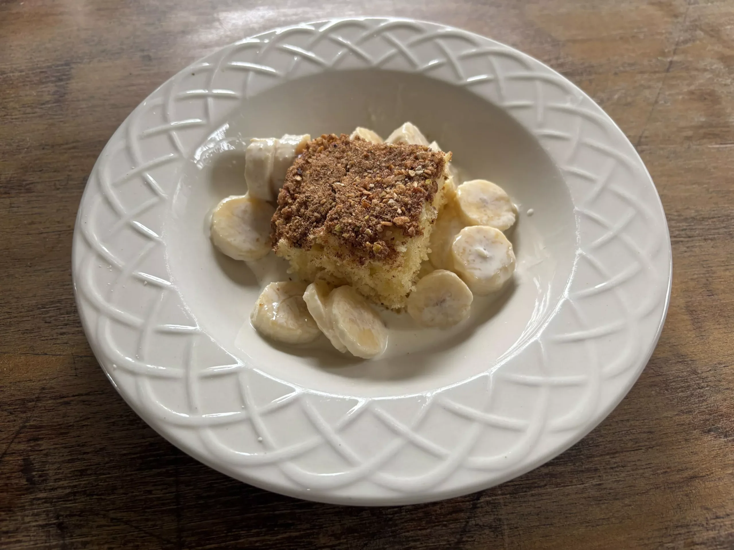 I decided to chop up some bananas and dust them with brown sugar and cream as a topping for this lovely little coffee cake, er, I mean, “breakfast squares.”