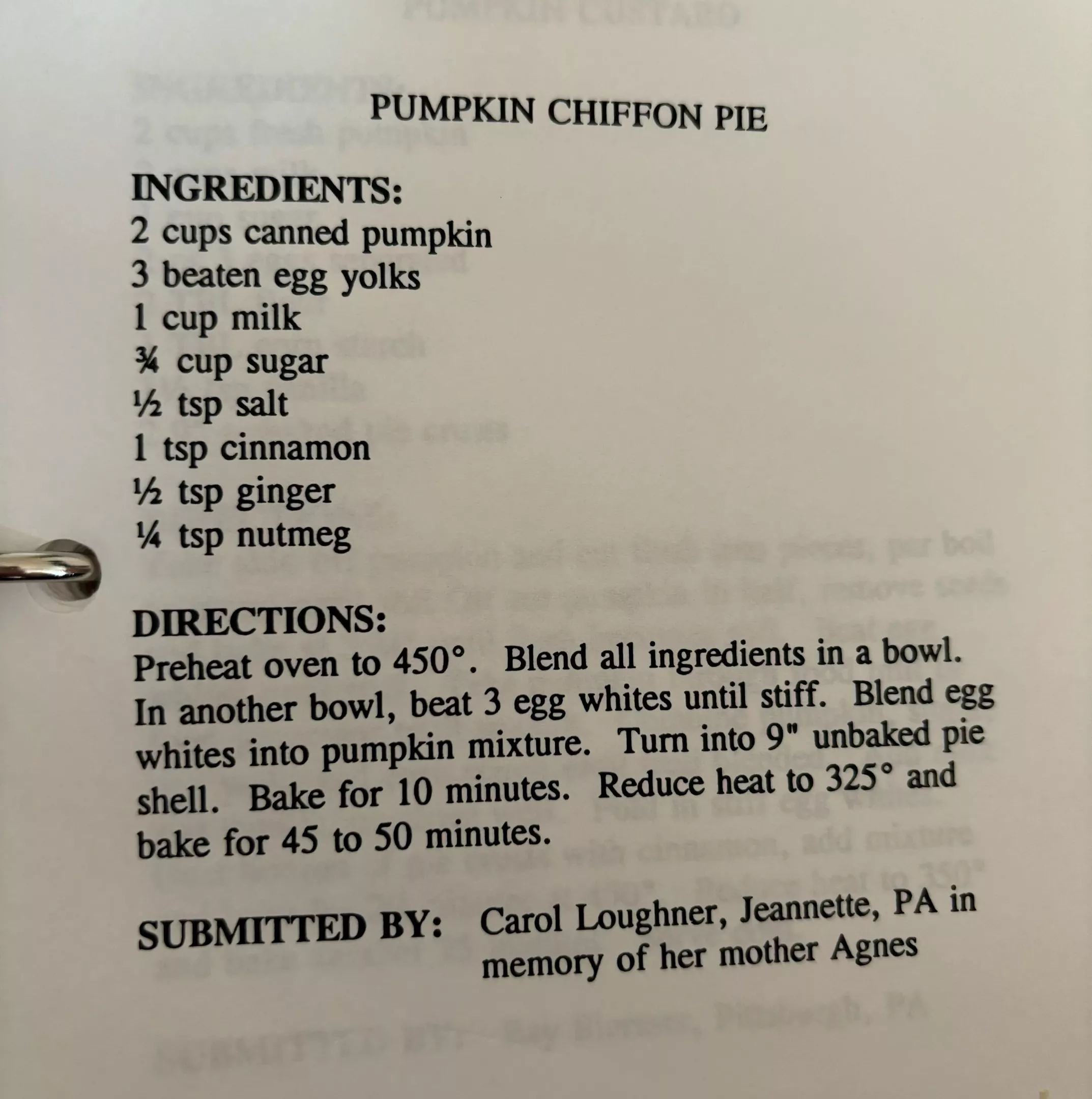 Yinz, this pie is good. If you don’t like the denseness of a traditional pumpkin pie, give this fancy chiffon pie a shot. It’s much lighter and creamier yet still maintains that good ol’ pumpkin pie flavor. It only took about 20 minutes to put together and 45 minutes to bake. You can be super last-minute with this dish and still get high-fives at holiday dinners.