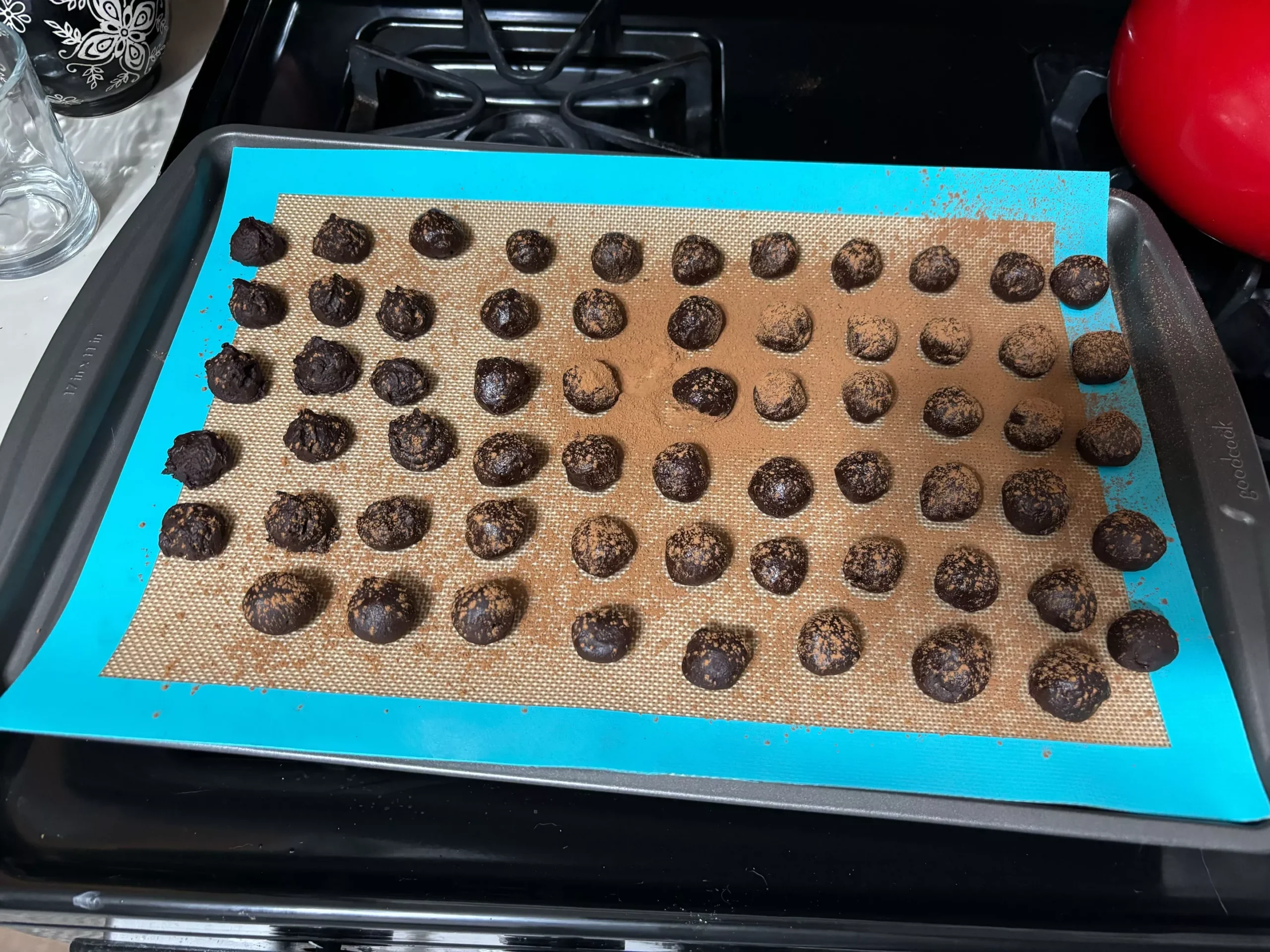 I scooped the chocolate mixture with a 1 tsp. cookie scoop and formed each scoop into a little ball. Then, I dusted them with Hershey’s unsweetened cocoa powder. My cut-in-half recipe produced 48 truffles.