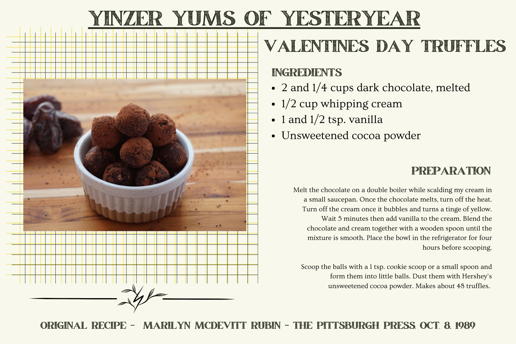 Prior to 1989, I couldn’t find a single chocolate truffle recipe that wasn’t swimming in alcohol — not on Newspapers.com nor in any of my throwback cookbooks. My partner and I are not big boozers, indulging only in the occasional glass of wine. Evidentially, our parents and grandparents’ generation really liked to get sauced! Maybe that’s why my grandparents had ten kids…