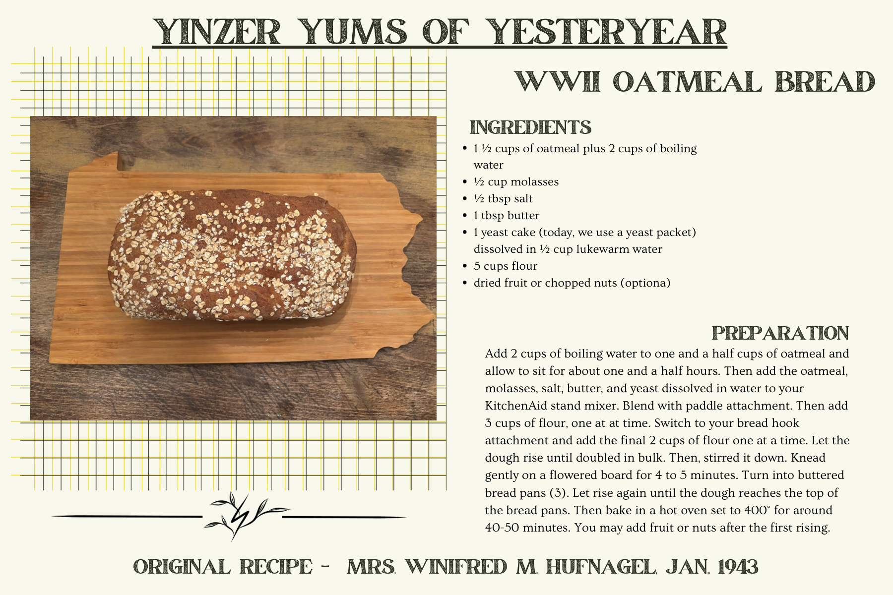 This oatmeal bread is a product of WWII ration planning, making good use of cheap ingredients and avoiding using large quantities of rationed goods. There is no sugar, no oil, and very little butter in this bread. Oats were, and still are, cheap, and they stretch out the recipe so you don’t need to use as much flour. This recipe also does not call for eggs, which fits with today’s “rations.”