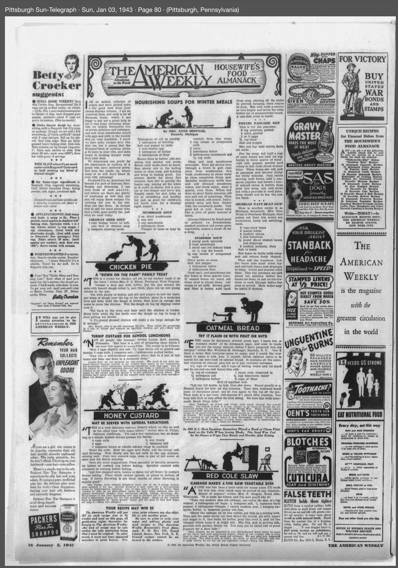 What appears to be a normal snapshot from a page of a Pittsburgh newspaper is anything but ordinary if you look between the lines. While there are ads for beauty products and local services plus an array of recipes meant to make every home warm and happy with loved ones gathered around the table, this page from The Pittsburgh Sun-Telegraph was printed in the midst of World War II.