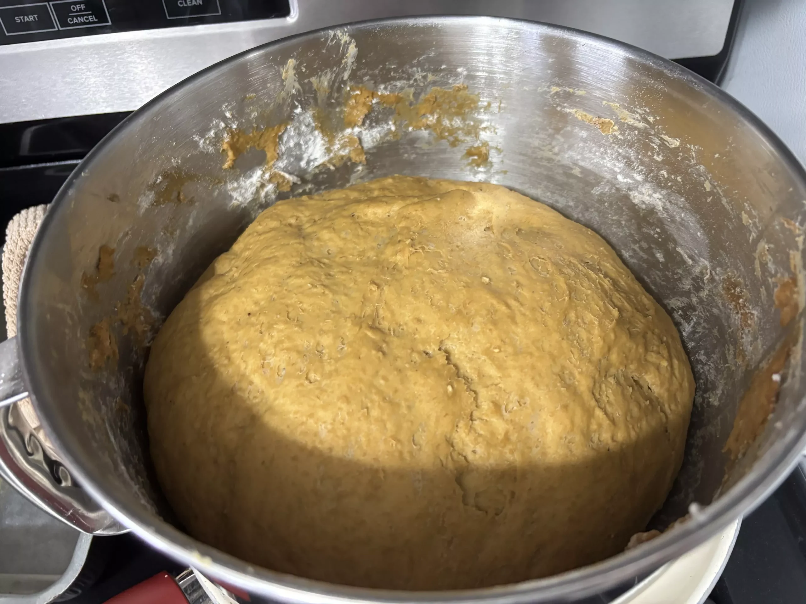 After the oatmeal came together, I followed the directions regarding combining the ingredients, but I did so in my KitchenAid stand mixer. I added the flour last, one cup at a time. I used my paddle attachment for the first three cups, then switched to my bread hook attachment before adding the fourth cup of flour.