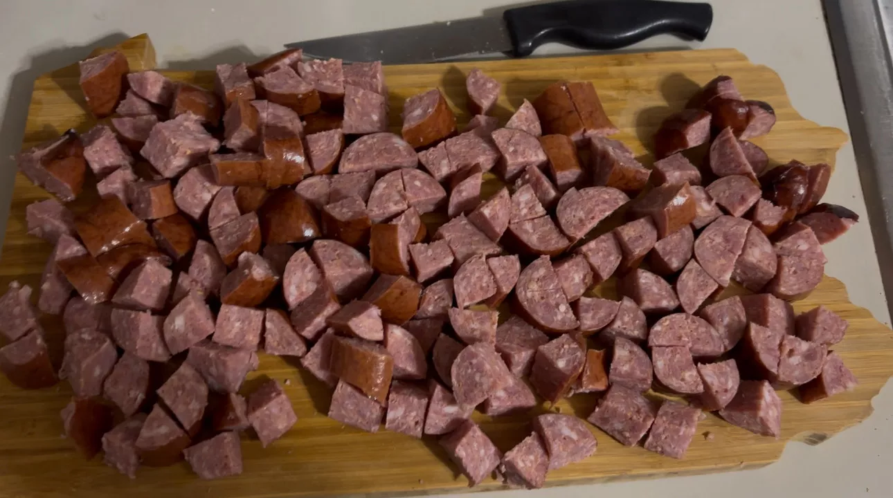 As I said, I replaced the ½ lb. chicken and ½ lb. pork with a full 1 lb. of sausage. I also used a dozen pre-cooked frozen mussels from Aldi since they were cheaper than fresh. I also already had homemade seafood stock in my freezer leftover from a crab dinner my partner made over the holidays, so I thawed that out and used it instead of making seafood stock from scratch. I placed it in a stockpot until it got hot. Then, I warmed my mussels in the seafood stock until they popped open. And I chucked my shrimp tails instead of using them in the stock.