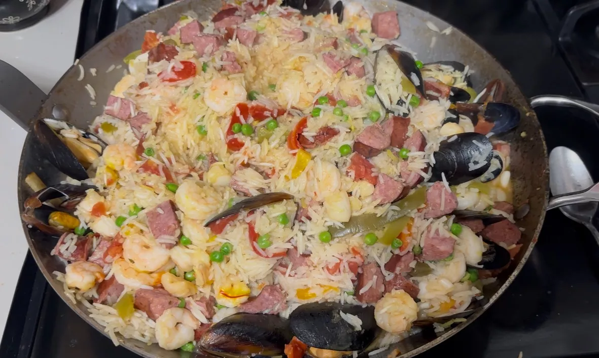 Add rice to the mixture and while stirring carefully Add boiling broth (mixture of chicken and seafood broth to make five cups) add peas, saffron, and salt. Tuck shrimp, scallops, and mussels into rice. Cover and place in a 325 to 350° oven for 20 to 30 minutes. Remove from oven and serve garnish with lemon wedges. Serves 8 to 10.