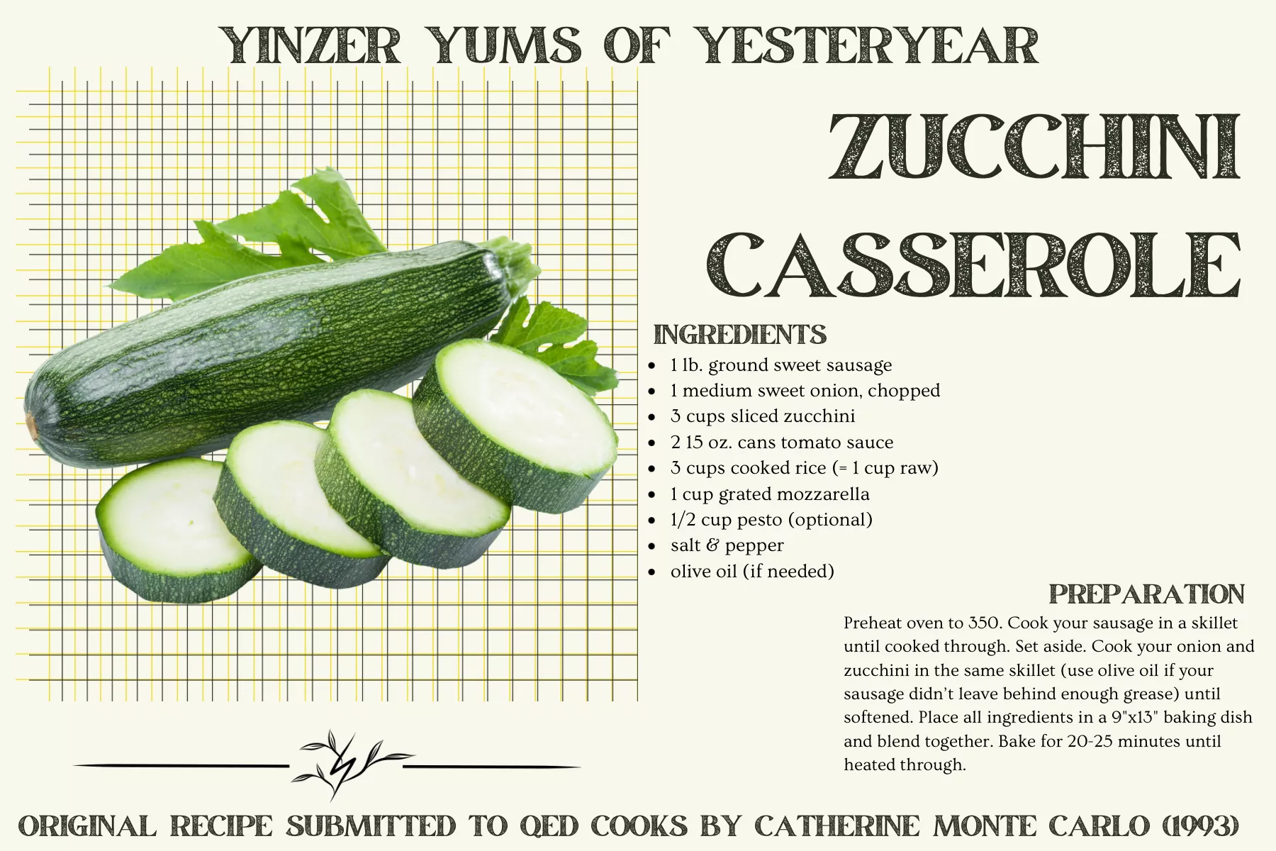 Before turning over my garden bed for the winter, I discovered one last massive zucchini hanging on the vine. So I busted out my QED Cooks: C is for Casseroles cookbook and searched for one of the original QED Cooks zucchini recipes.