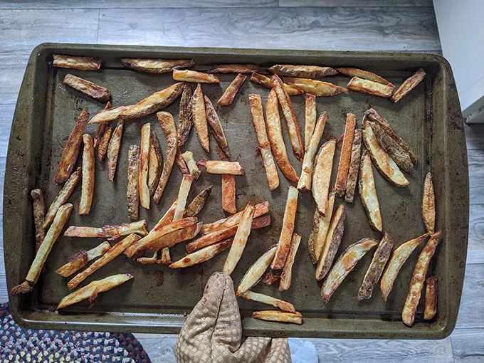After a Google search, I came to the conclusion that my oven would do the trick. I layed out my cut potatoes on a sheet pan, doused them in more oil than I meant to, dusted them with salt, and threw them in the oven at 400 degrees for an uncertain amount of time. (Patchy said 380 degrees and 25 minutes in an air fryer, but those numbers did not translate to an oven.)