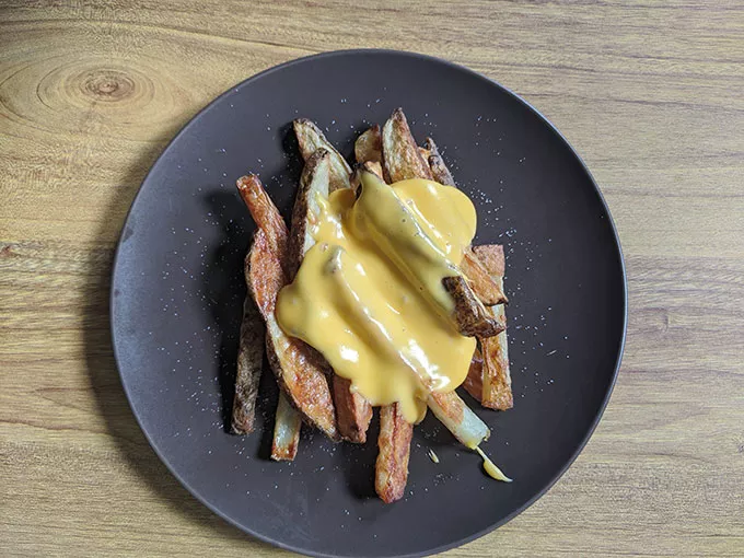 It took about 40 minutes for my fries to be fully cooked. The oven method worked quite well; my fries were crispy and golden. Following the video, I piled them on a plate and drowned them in cheese sauce.